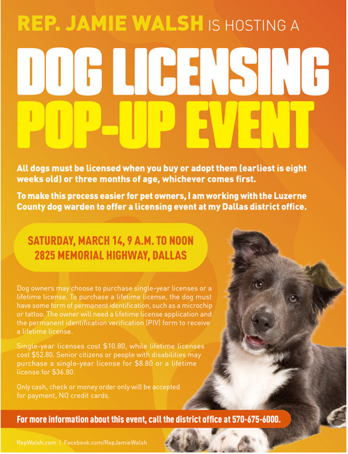 Dog owners may choose to purchase single-year licenses or a lifetime license. To purchase a lifetime license, the dog must have some form of permanent identification, such as a microchip or tattoo. The owner will need a lifetime license application and the permanent identification verification (PIV) form to receive a lifetime license. Single-year licenses cost $10.80, while lifetime licenses cost $52.80. Senior citizens or people with disabilities may purchase a single-year license for $8.80 or a lifetime license for $36.80. Only cash, check or money order only will be accepted for payment; NO credit cards.
