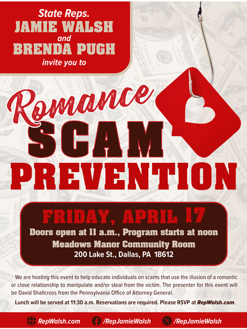 Java With Jamie – Thursday, March 26, 10-11:30 a.m. at The Lakeside Skillet, 3075 Lakeside Drive in Harvey’s Lake. Enjoy coffee and light fare while talking about state government issues important you, such as the state budget, education, data centers, property taxes and more. Please click here to register for event.