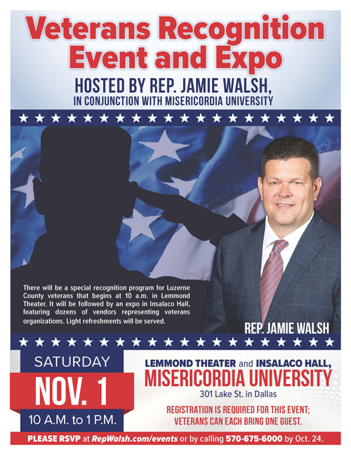 The event, hosted in conjunction with Misericordia University, will include a recognition ceremony along with dozens of vendors offering programs and services for veterans and their family members. Light refreshments will be served.
