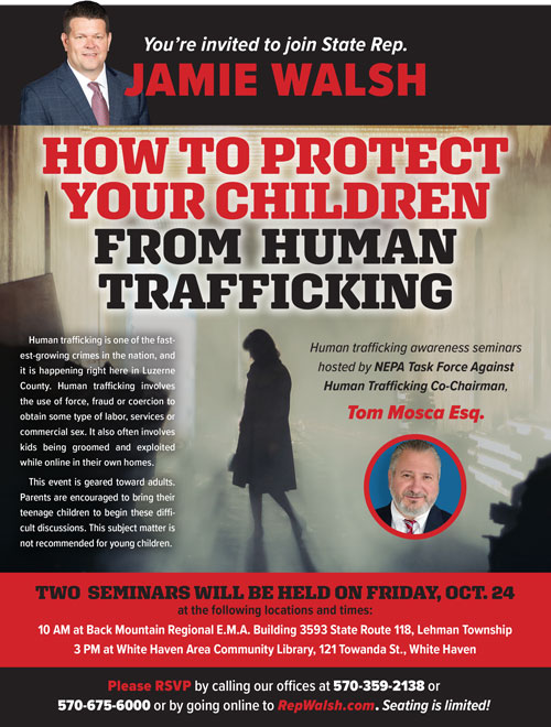You’re invited to join state Rep. Jamie Walsh for two human trafficking awareness seminars in our area hosted by NEPA Task Force Against Human Trafficking Co-Chairman Tom Mosca Esq.